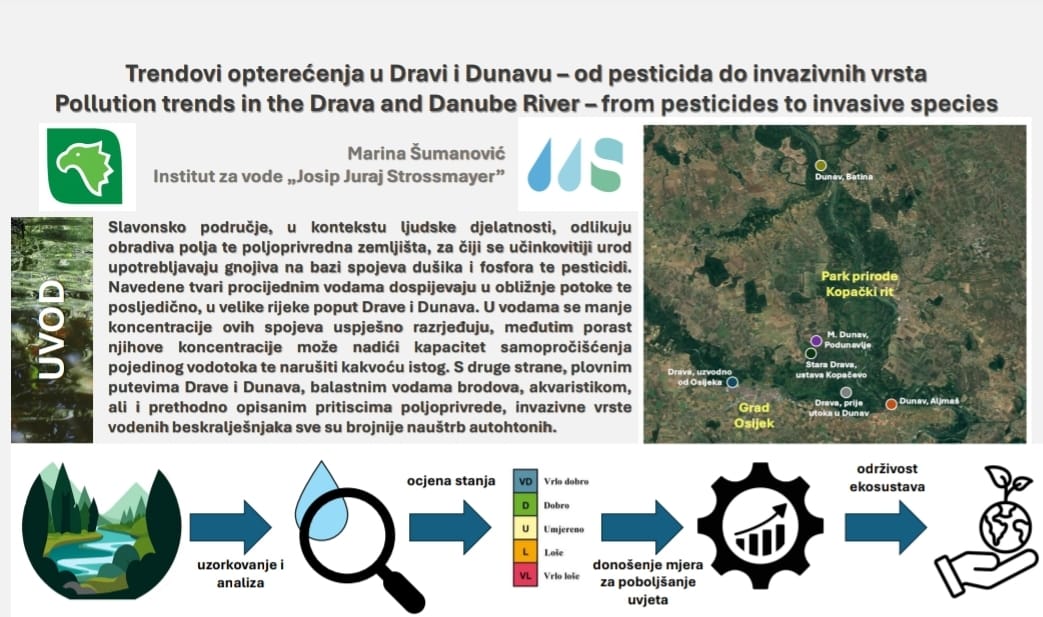 Josip Juraj Strossmayer Water Institute participated in this year’s event through its employee, Marina Šumanović, who presented the research “Pollution Trends in the Drava and the Danube – from Pesticides to Invasive Species.” The study included five years of monitoring nutrients, pesticides, and invasive aquatic invertebrates. The results showed that nutrient concentrations in the Drava and the Danube remain consistently high, while river side arms tend to accumulate ammonium and phosphates. Invasive species were found to be most numerous in the Danube, while pesticide levels were recorded within permitted limits.